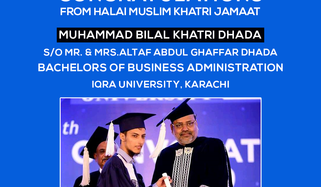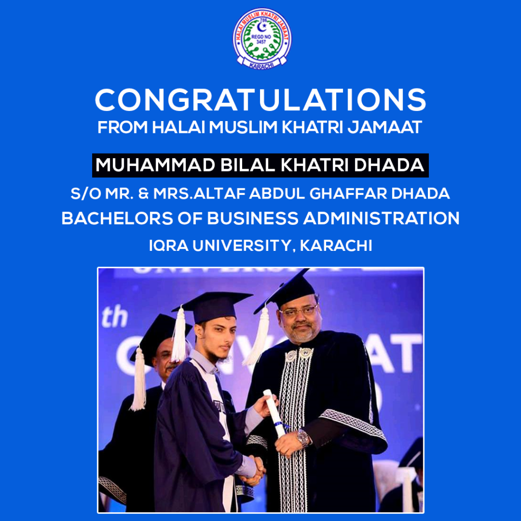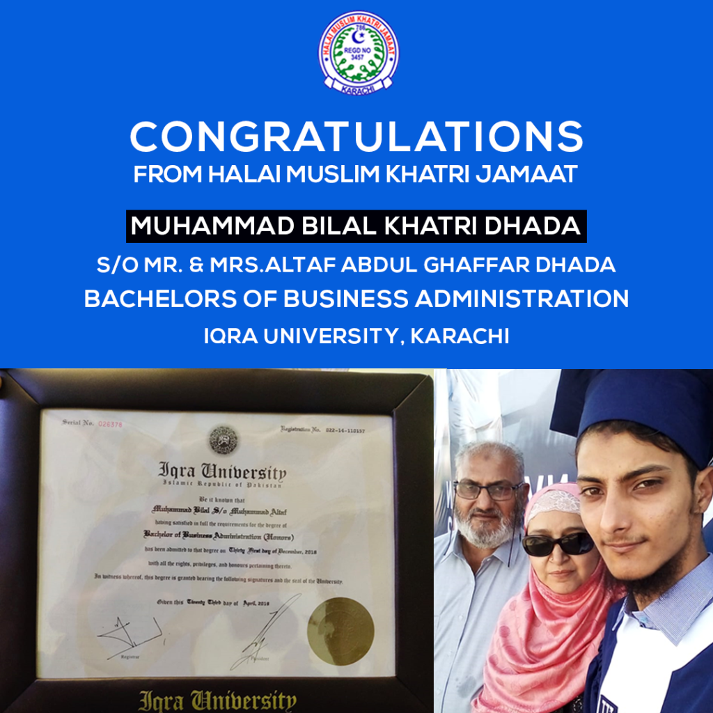 Halai Muslim Khatri Jamaat Karachi > Appreciations > Congratulations to Muhammad Bilal Khatri Dhada S/o Mr. & Mrs. Altaf Abdul Ghaffar Dhada